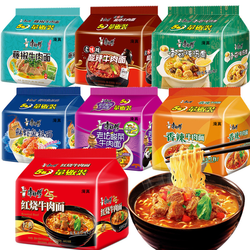康师傅方便面经典香辣牛肉面袋装五连包夜宵...